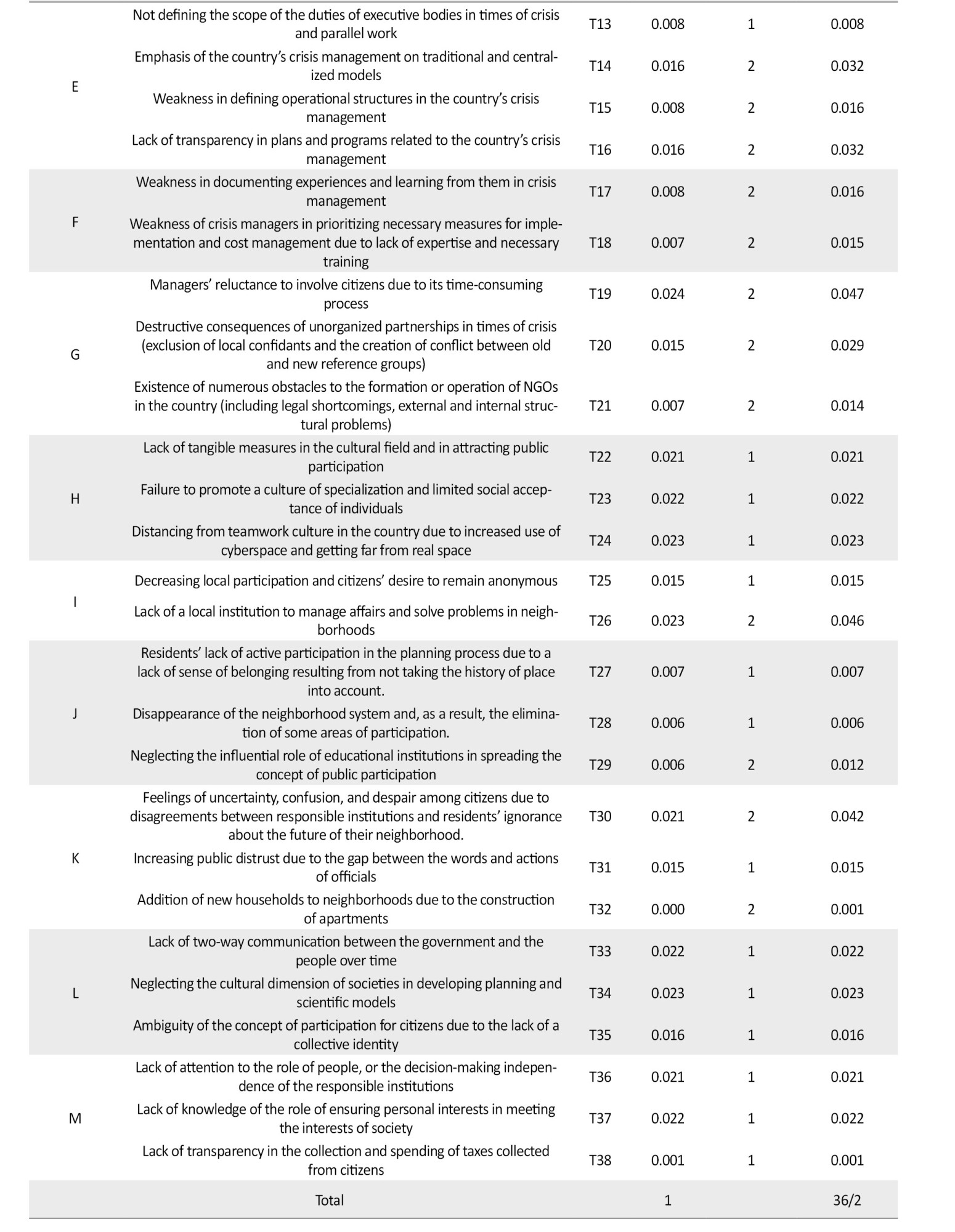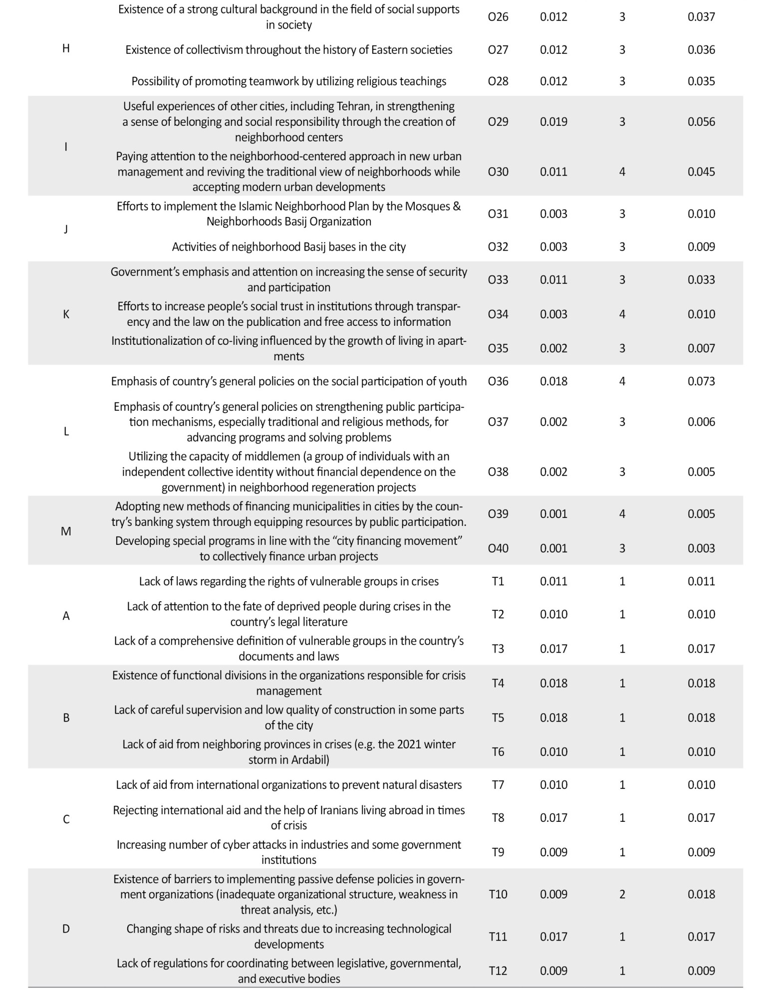 Mohabati-Zahan et al. (2020) classified the factors affecting crisis management using the approach of building the capacity in local communities into four groups: “prevention and mitigation of the crisis”, “preparedness for the crisis”, “coping with the crisis”, and “reconstruction and recovery after the crisis”. Salehi Nodez et al. (2021) concluded that increasing the spirit of cooperation and motivating people to participate in crisis management are among the best ways to reduce communities’ vulnerability. Ahadnejhad-Roshti et al. (2022) found that four components, including participation/social networks, social capital, knowledge/skills, and knowledge/awareness, had the greatest impact on enhancing the community’s resilience to the COVID-19 pandemic.