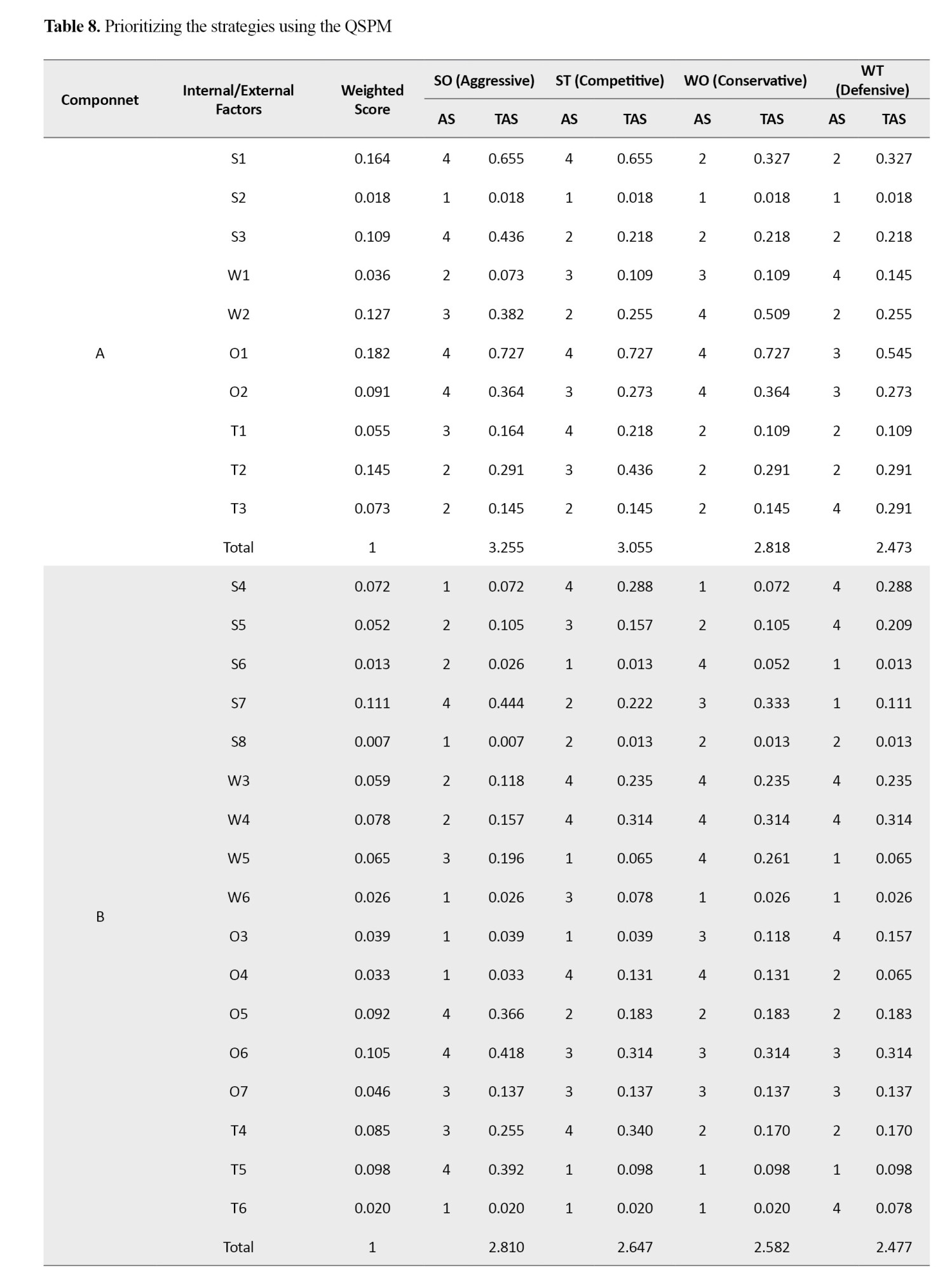 In Table 7, four types of strategies are presented for each study component, based on expert opinions and the four parts of the SWOT matrix.