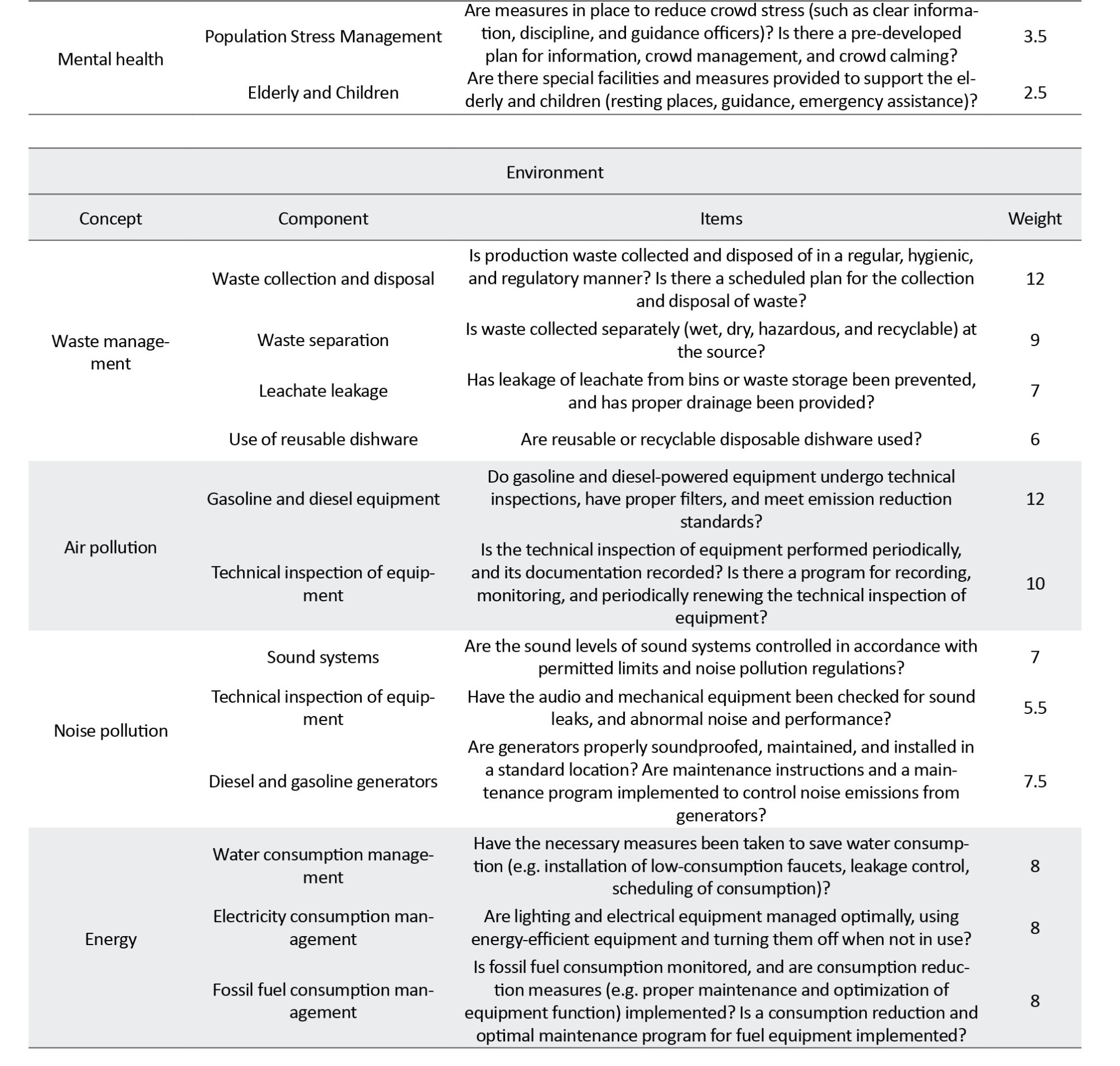 Among studies related to the environment domain, Johansson et al. (2012) showed a link between population density, increased pollution, and the prevalence of respiratory diseases in urban settings. Also, the Centers for Disease Control (CDC) guidelines emphasize the importance of controlling environmental factors such as ventilation, ambient temperature, and water quality in mass gatherings. Johansson et al. (2012) indicated the weakness in waste management and the lack of sustainable infrastructure in urban events, which can lead to pollution of natural resources and a threat to public health.