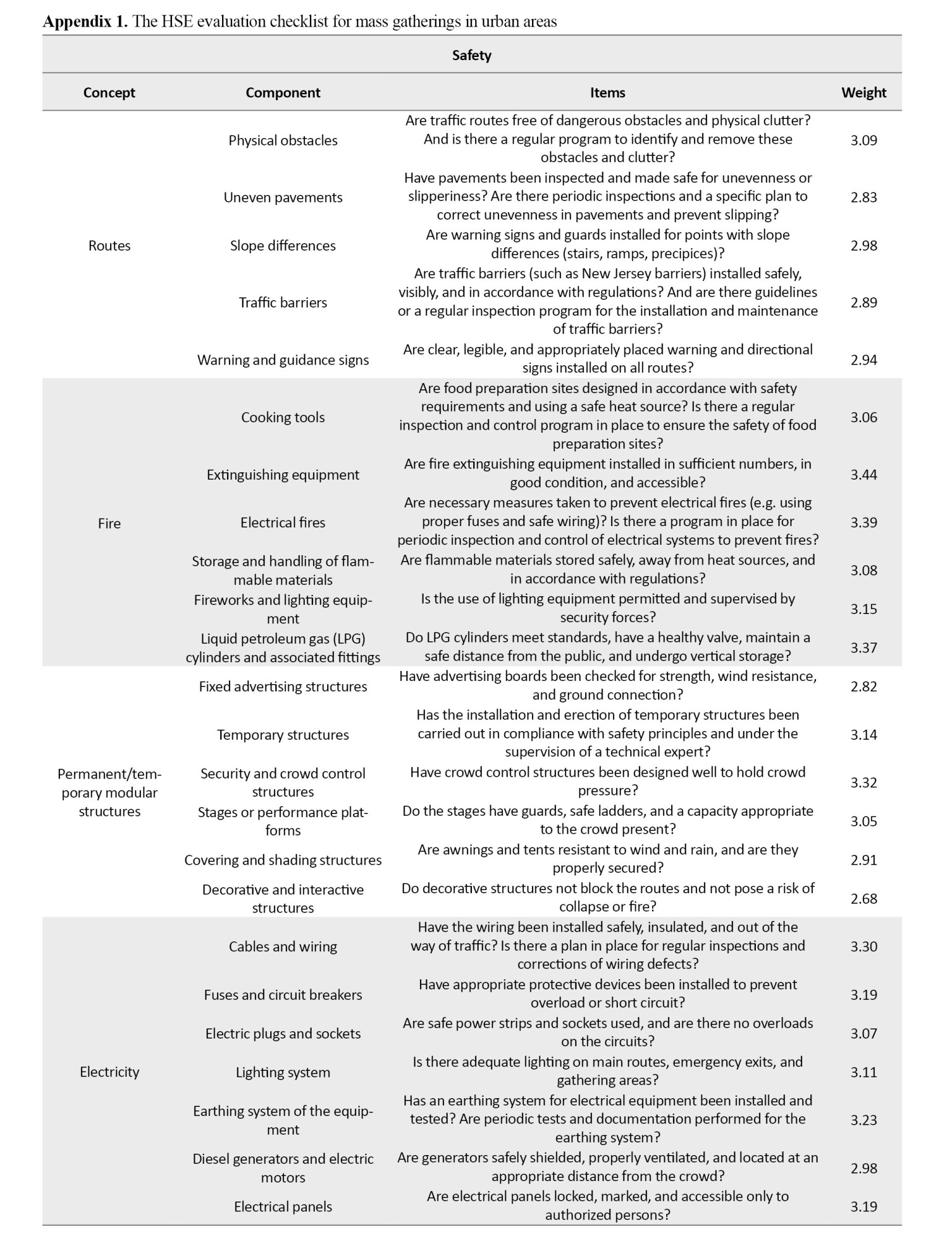 By focusing on micro and operational components, including electrical safety, temporary structures, food hygiene, waste management, and legal requirements, the designed checklist can identify and address gaps in current planning for mass gatherings in urban areas in Iran. The checklist has high content validity and reliability (internal consistency). The following recommendations are provided: