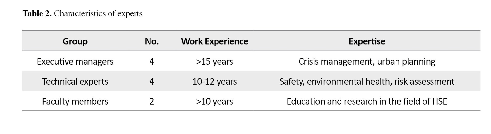 Based on the collected data, an initial list of items related to the three main axes of health, safety, and environment in mass gatherings was prepared. To refine and complete this list, group meetings were held with the participation of 10 HSE experts. This panel of experts was purposefully selected from three groups of specialists (Table 2) to consider different executive, technical, and scientific perspectives in refining the items.